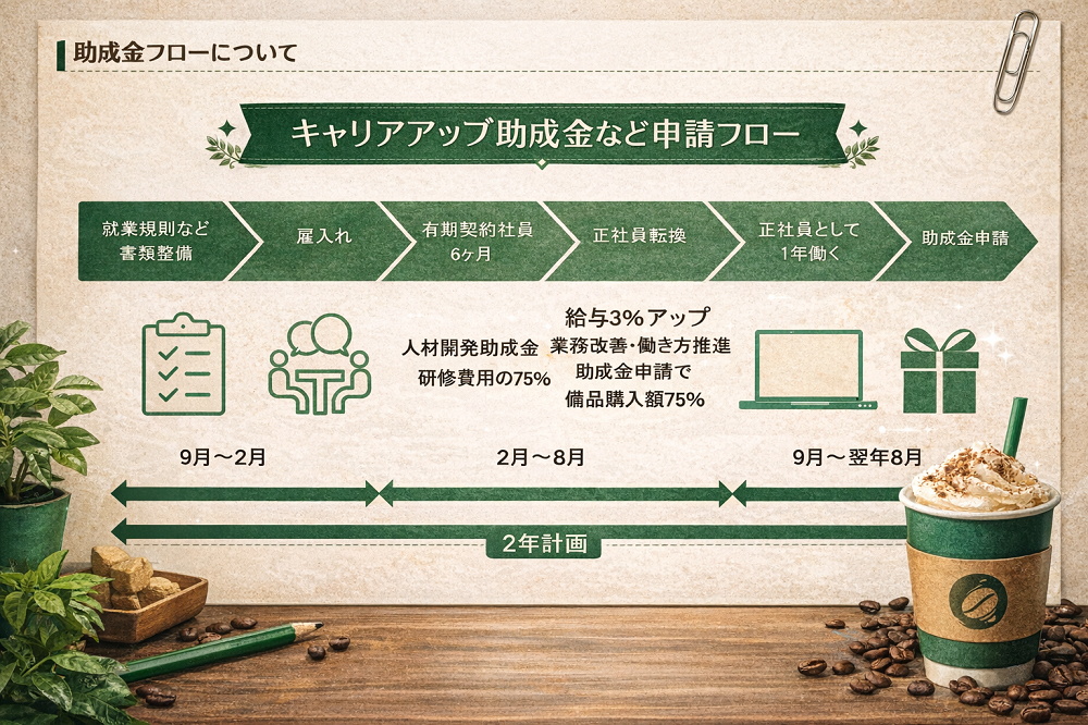 ご参考までに、キャリアアップ助成金の申請フロー(2年計画)になります。